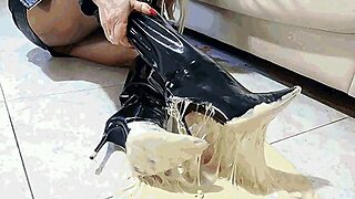 Driving in leather knee high boots and handjob in bordeaux leather gloves